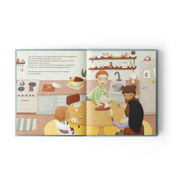Eigentlich liebt es Matilda, Schmetterlingsnudeln zu essen und ihrer Familie dabei von ihren aufregenden Abenteuern zu erzählen. Aber heute schmeckt das Abendessen anders als sonst. Und reden möchte sie auch nicht. Während alle am Tisch sitzen, beginnt plötzlich ein Gefühlssturm in ihr zu toben. Erst nach einiger Zeit holt Matilda ihre Eltern in ihre Gedankenwelt und gemeinsam erkennen sie, dass wir alle mal Tage haben, an denen alles zu viel wird und die sich anfühlen wie ein schwerer Rucksack voller Kieselsteine …